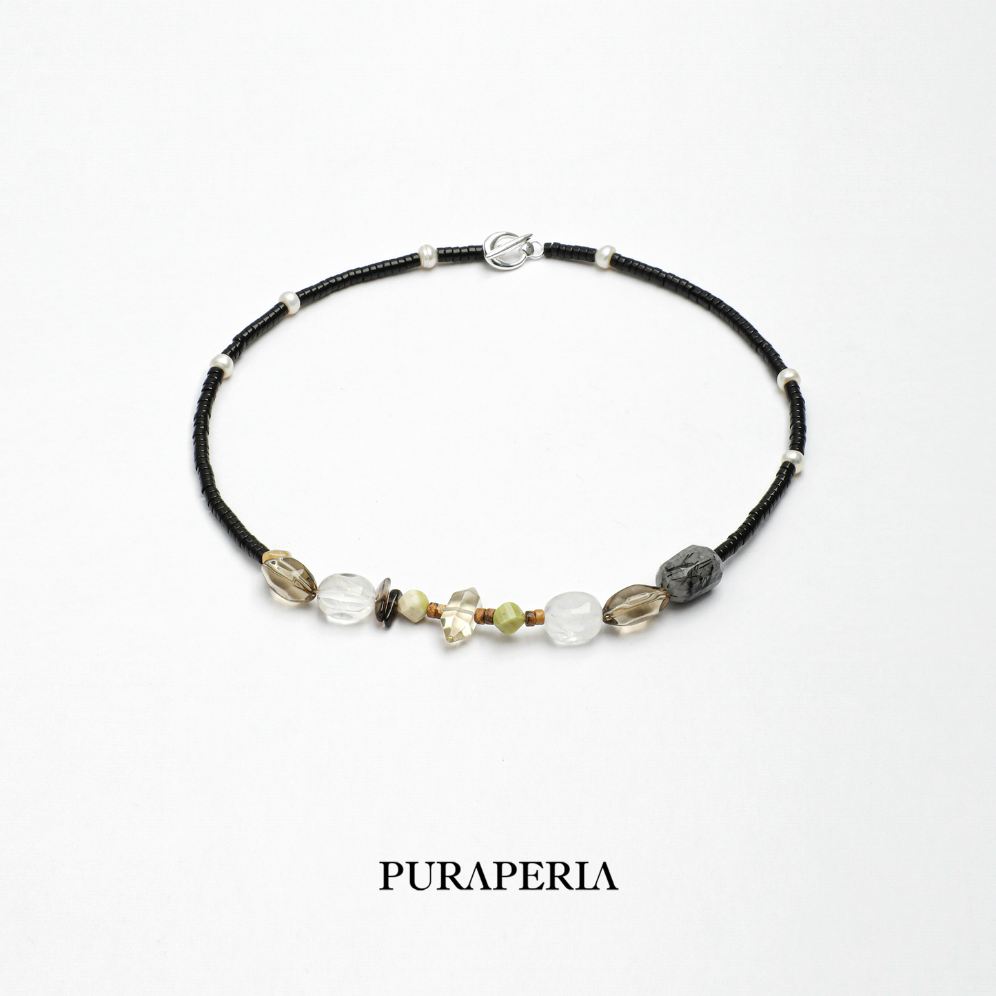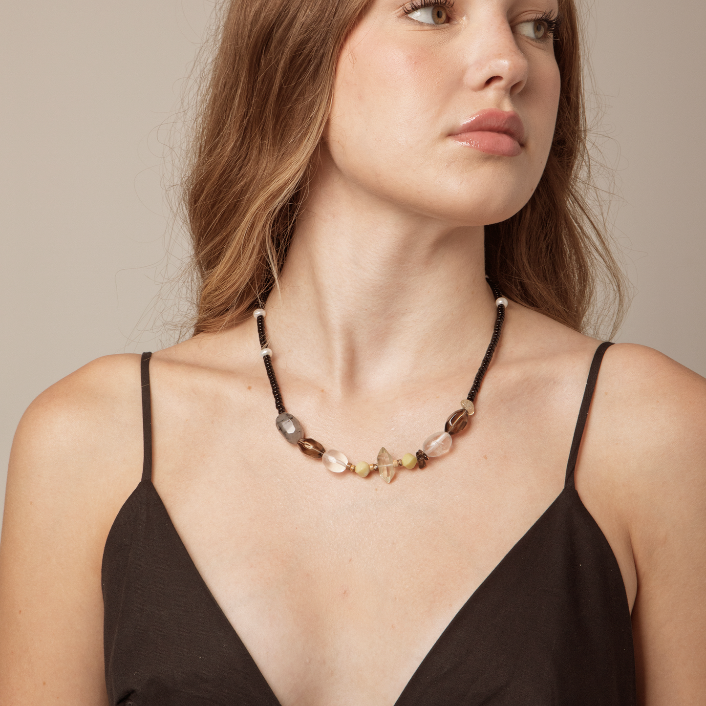 The Chain: Composed of polished black onyx cylinders and subtle textured pearls, offering a sophisticated contrast.