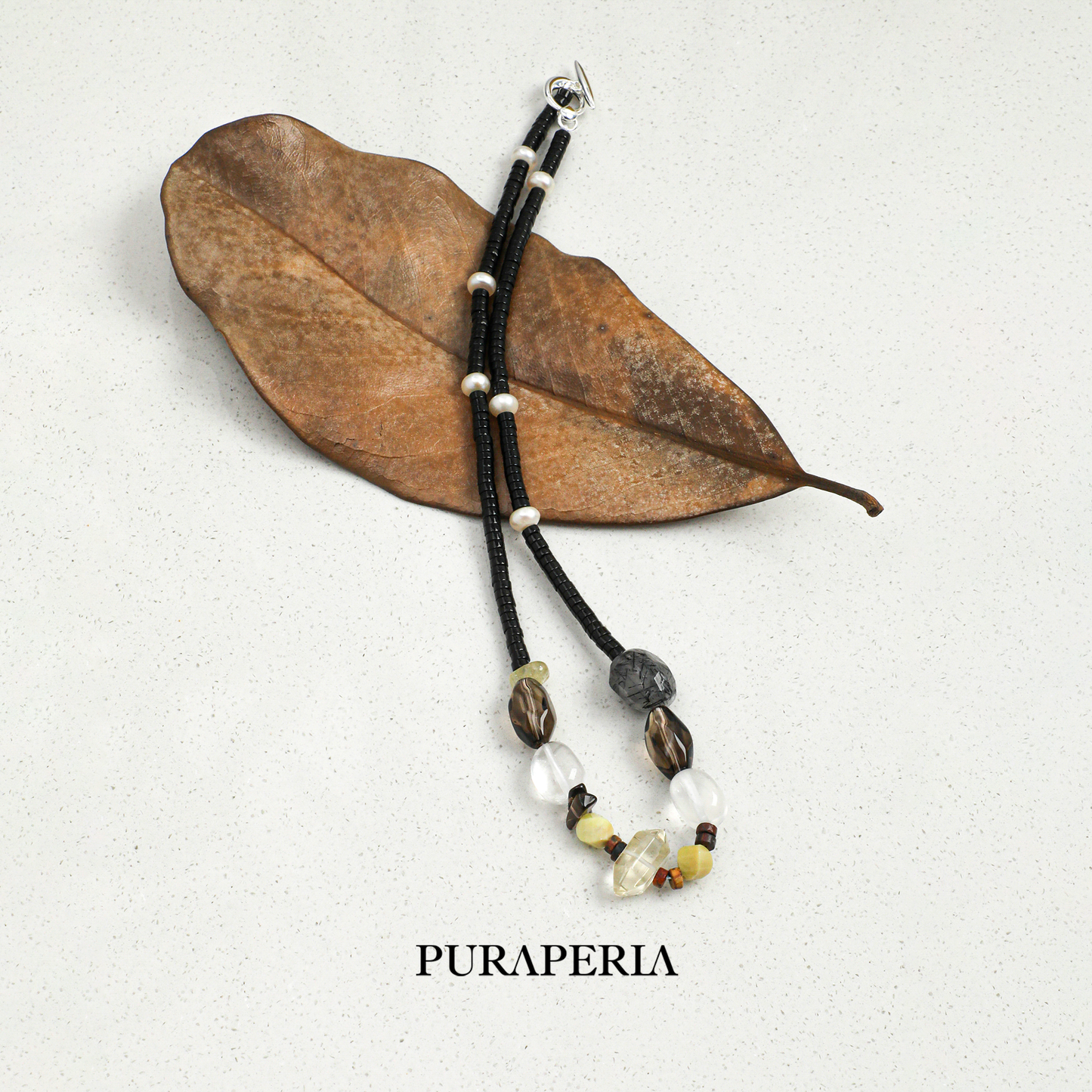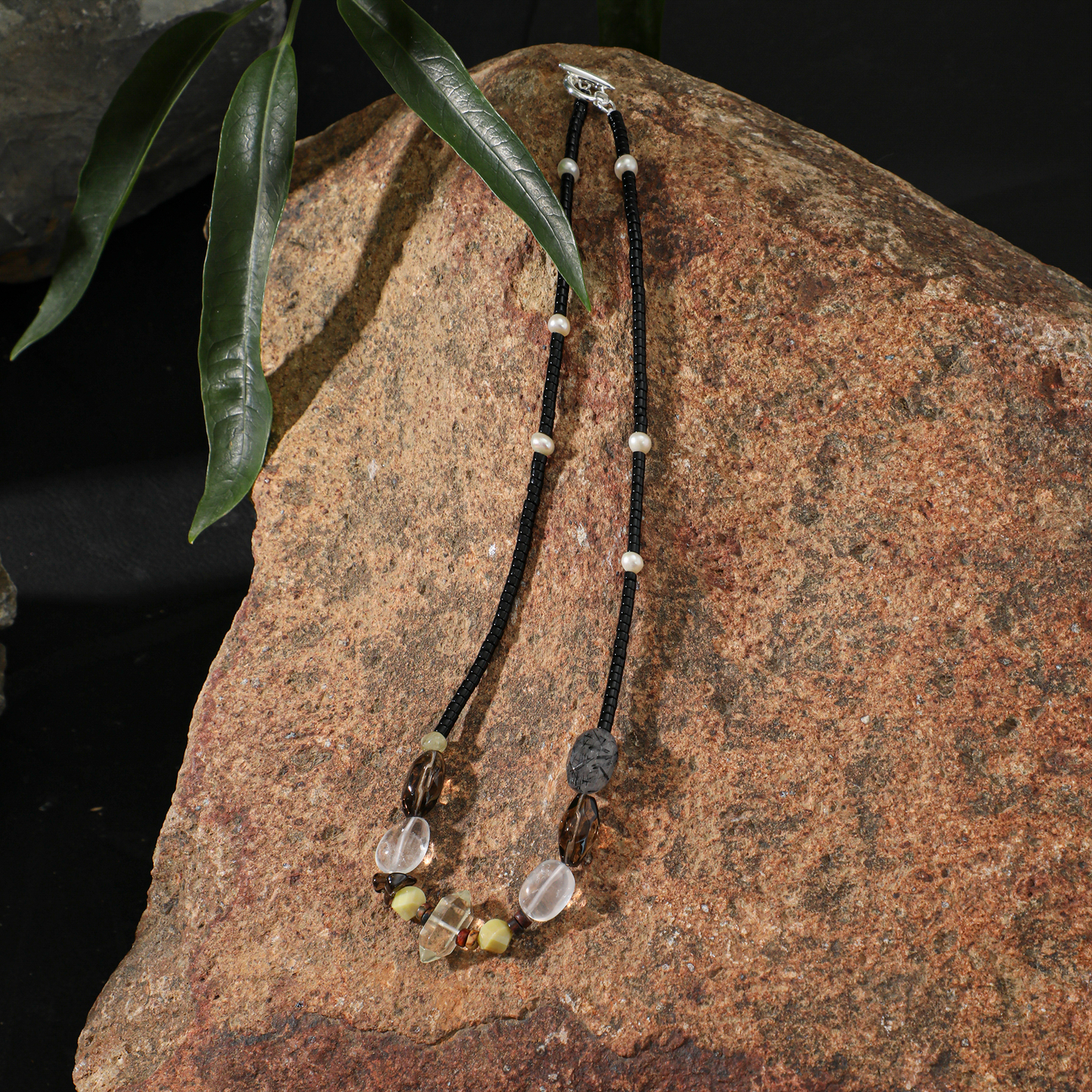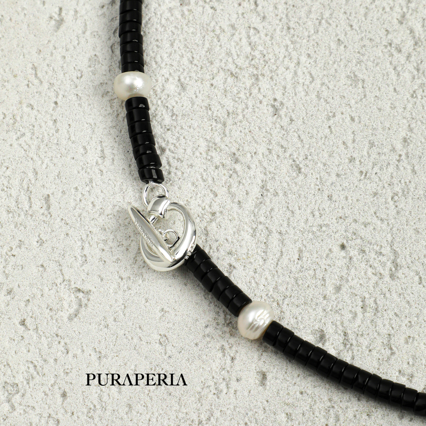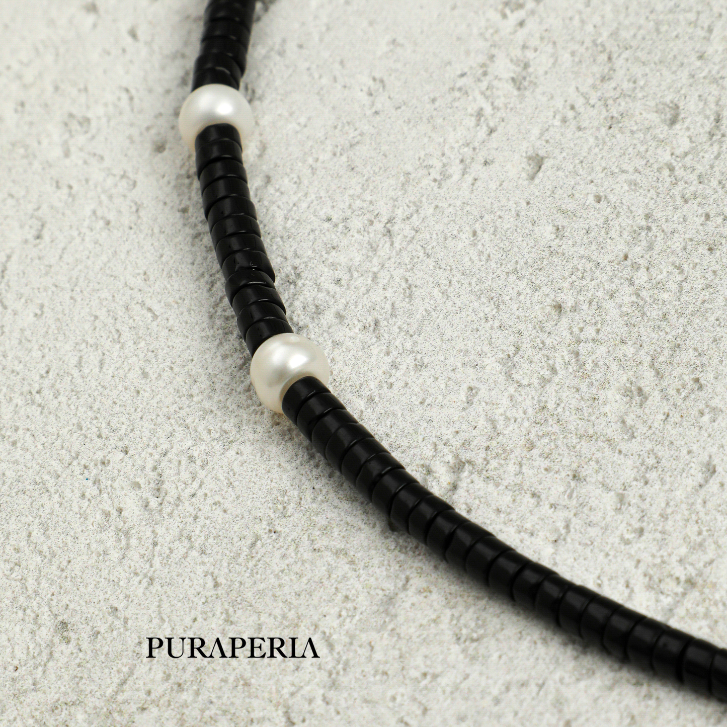 The Chain: Composed of polished black onyx cylinders and subtle textured pearls, offering a sophisticated contrast.