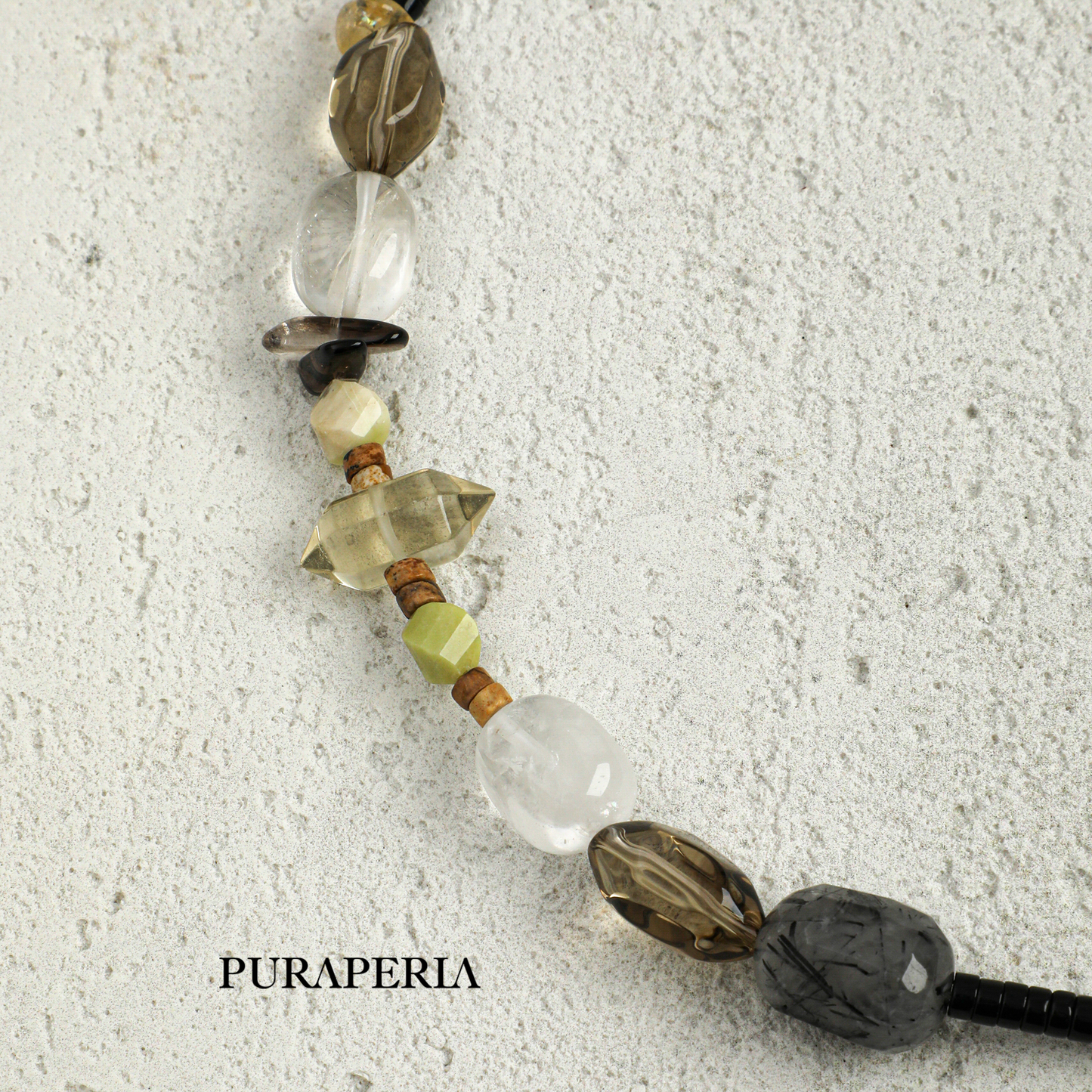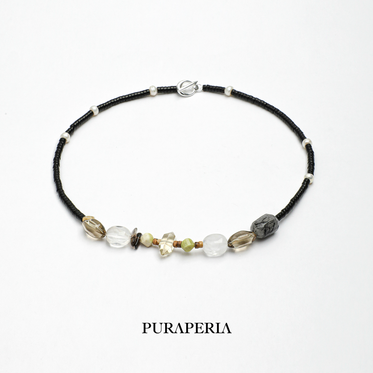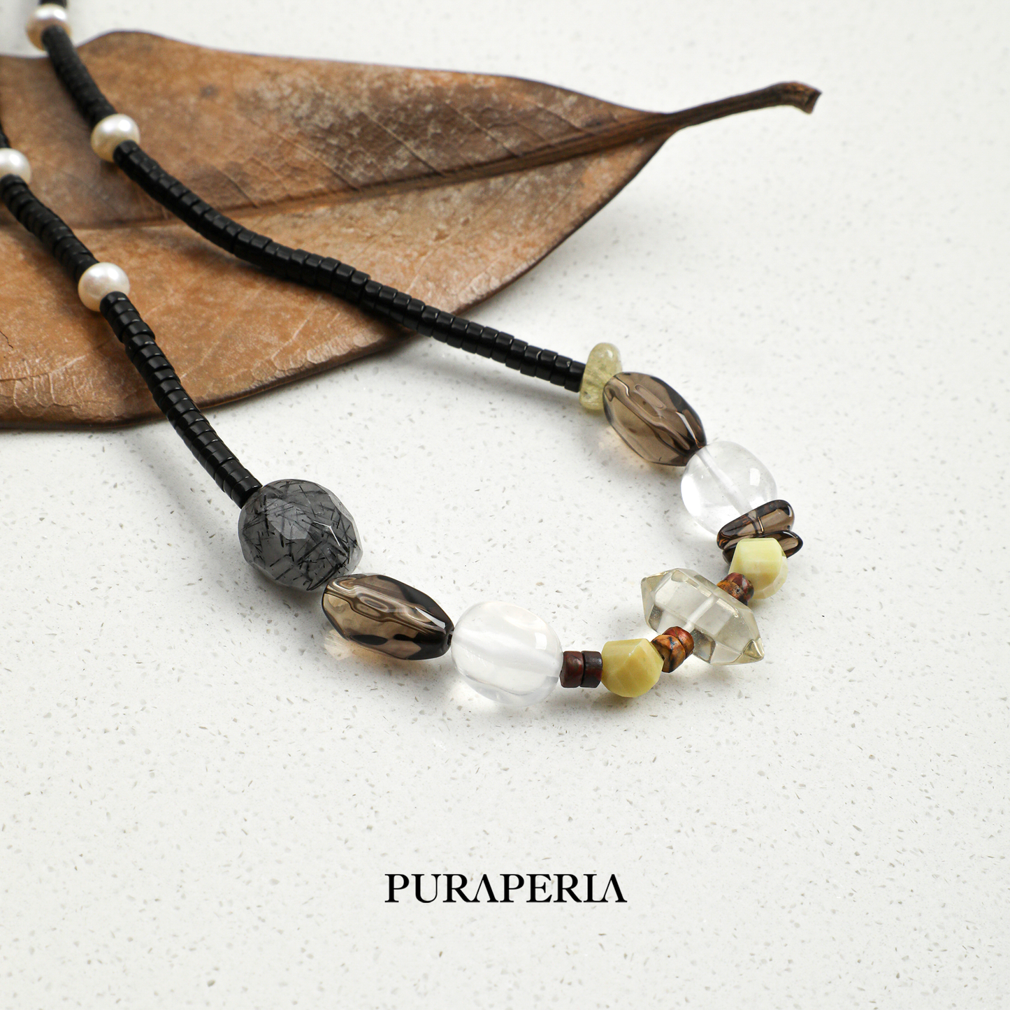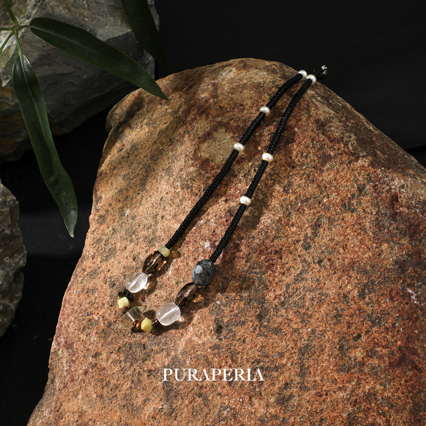 The Chain: Composed of polished black onyx cylinders and subtle textured pearls, offering a sophisticated contrast.